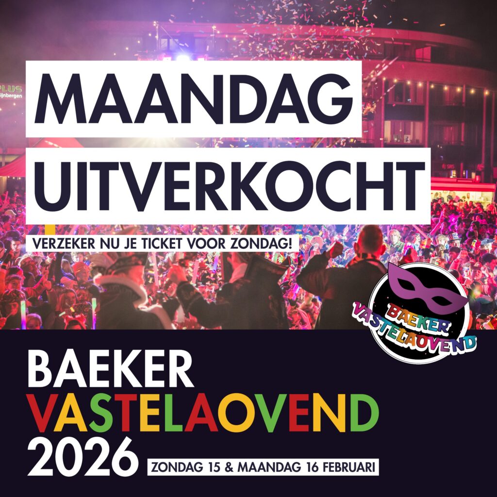 De Baeker Vastelaovend is op maandag uitverkocht! We gaan er samen een geweldig feest van maken! Kan je onverwacht toch niet komen en wil je kaartjes verkopen? Op zoek naar een last minute ticket? Koop en verkoop veilig via onze ticketswap pagina. We zien veel valse aanbiedingen langs komen via social media, voorkom teleurstellingen en koop alleen via de officiƫle ticketswap site.